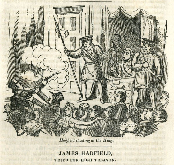 James Hadfield (or Hatfield) attempting to assassinate King George III in 1800 during the playing of the National Anthem at the Theatre Royal, Drury Lane, London. Hadfield was tried for High Treason but was acquitted by reason of insanity, being confined to Bethlem Royal Hospital (Bedlam) for the remainder of his life.
